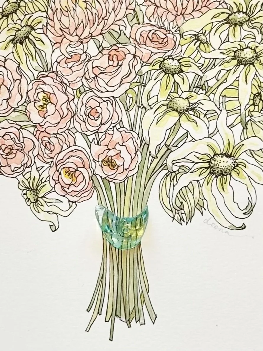 Bespoke bridal bouquet and buttonhole paintings using fine ink line and soft watercolour, individually crafted for you. Each painting is further embellished with a shard of either vintage china or coloured glass to visually hold the bouquet together