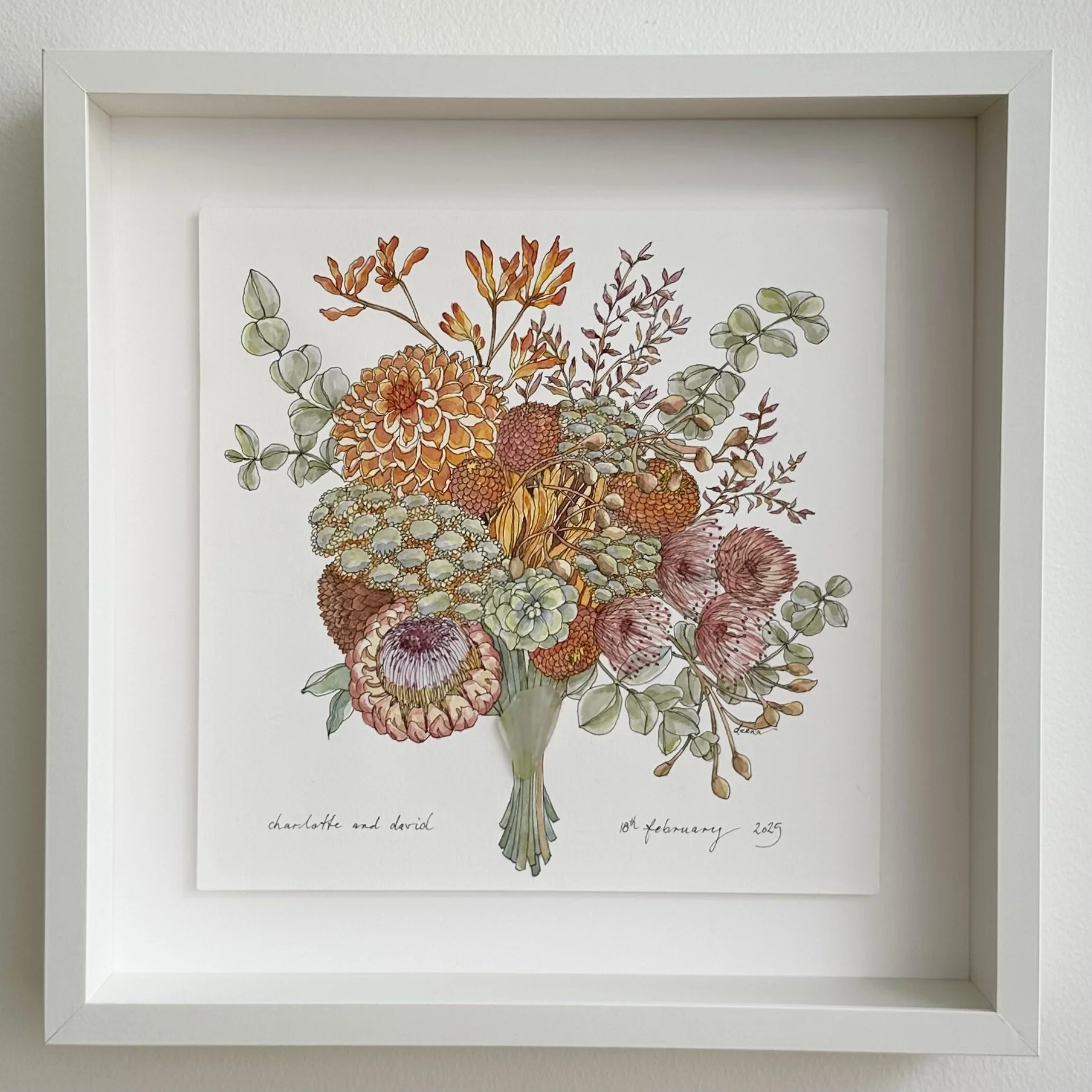 Each painting is made-to-order, then framed in a simple white shadow-box frame (27cm x 27cm x 6cm), a beautiful one-of-a-kind memento of your very special day